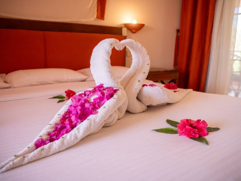 nacházejí se v hlavní budově, obsahují koupelnu s vanou, WC, fén, klimatizaci, trezor, satelitní TV, mini bar, balkon nebo terasu, výhled na bazén nebo moře a do zahrady